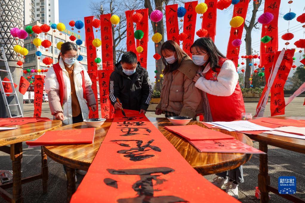 1月12日,貴州省畢節(jié)市七星關(guān)區(qū)青龍街道辦事處書(shū)法愛(ài)好者為居民書(shū)寫(xiě)春聯(lián)。新華社發(fā)(韓賢普攝)
