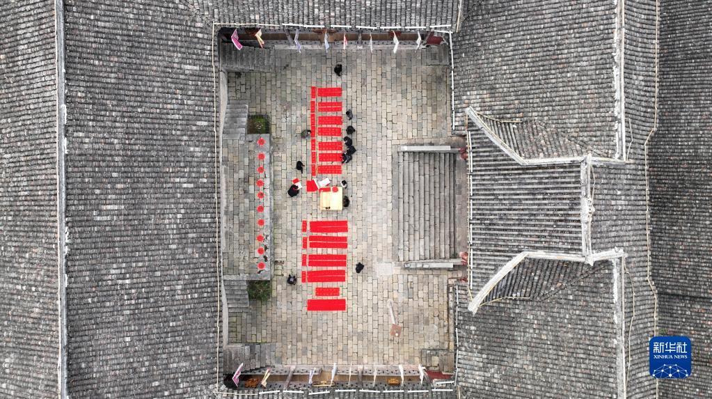 1月12日,在重慶市酉陽土家族苗族自治縣龔灘古鎮(zhèn),居民在寫春聯(lián)(無人機(jī)照片)。新華社發(fā)(邱洪斌攝)