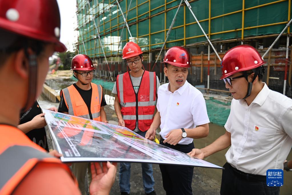 在浙江省寧波市奉化區(qū)蕭王廟街道滕頭村,傅平均(右二)在村黨群服務中心大樓建設工地察看施工進展(9月16日攝)。新華社記者 黃宗治 攝