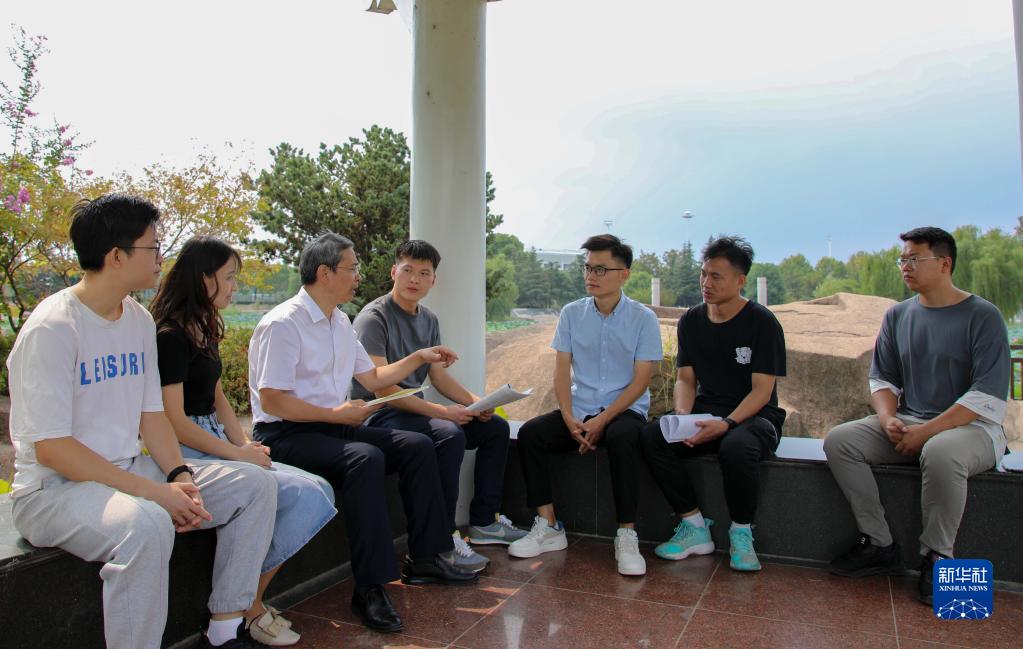 9月12日,安徽師范大學馬克思主義學院教授路丙輝(左三)與學生們在校園內(nèi)的文思亭交談。新華社記者 曹力 攝