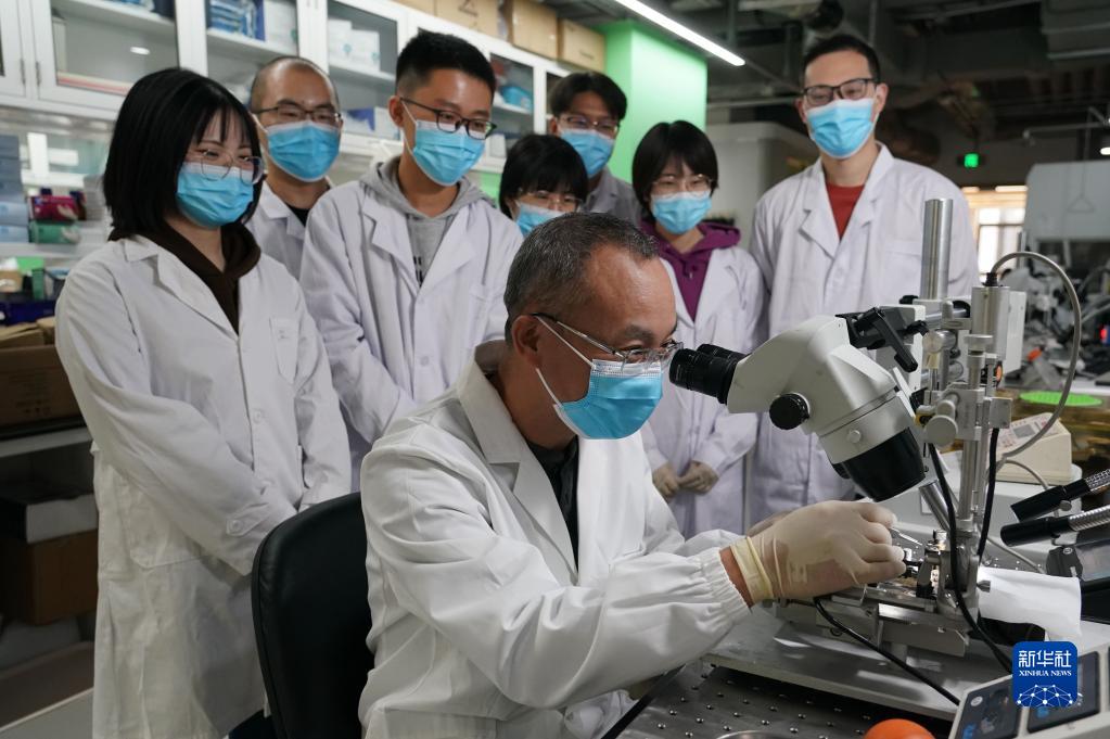 10月17日,北京腦科學(xué)與類腦研究中心聯(lián)合主任羅敏敏(前)在實驗室為學(xué)生示范立體顯微注射操作。新華社記者 任超 攝