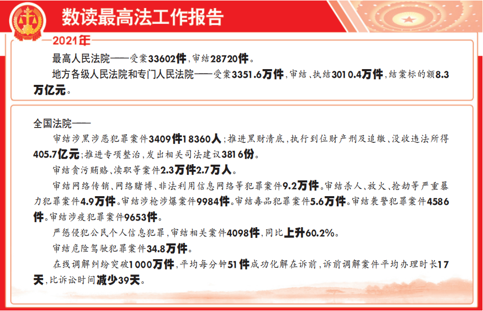 過去一年,司法前行的印記更加清晰,法治中國的腳步更加堅毅,報告中的一個個案例,傳遞了鮮明的價值導(dǎo)向,讓法律條文走進千家萬戶。報告中的一串串?dāng)?shù)據(jù),勾勒出平安中國、法治中國建設(shè)新成效:2021年,最高人民法院受理案件33602件,審結(jié)28720件,制定司法解釋24件,發(fā)布指導(dǎo)性案例31個;地方各級人民法院和專門人民法院受理案件3351.6萬件,審結(jié)、執(zhí)結(jié)3010.4萬件,結(jié)案標(biāo)的額8.3萬億元,助推實現(xiàn)國家安全、社會安定、人民安寧。